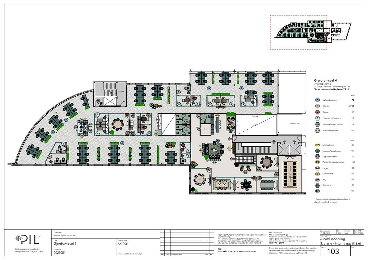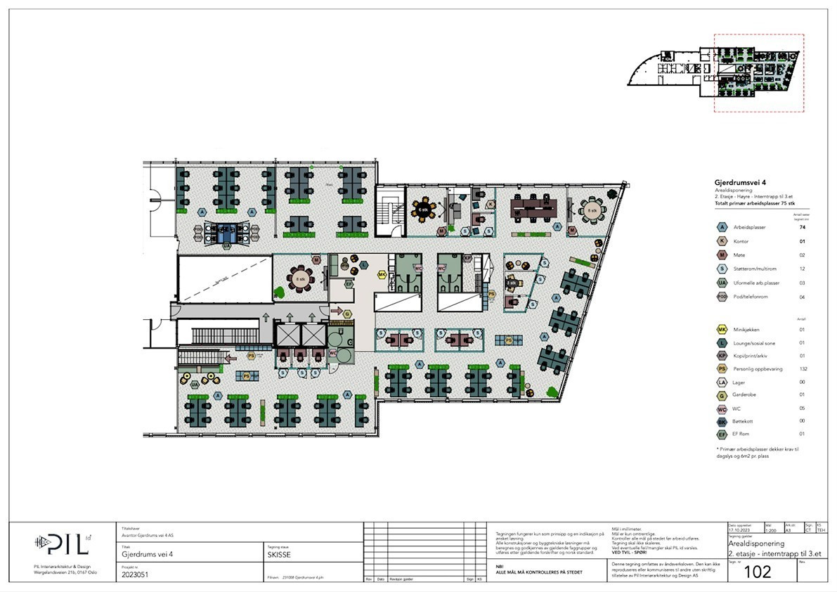 Lokalene i 2. etg og 3. etg kan leies som separate enheter, eller samlet til en større kunde, der totalt leieareal vi kan tilby er på 2.776 kvm BTA. I en samlet løsning til 1 kunde på begge etasjene er det plass til ca. 150 ansatte. Etasjene kan bindes sammen ved å etablere en interntrapp. I forslaget er hovedinngang med sosial sone og møterom plassert i 3. etg.